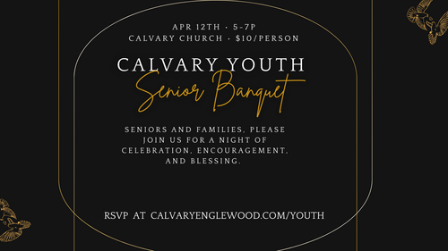 We would love to invite you to Calvary Youth’s Senior Banquet! It has been such an honor for all of us at Calvary Church to watch your student grow into the young man or woman they are today. As your church family, we are excited to celebrate your graduating senior with a special banquet on April 12th at Calvary Church. The purpose of this evening is to honor the Lord for His faithfulness in your senior’s life, while also encouraging, celebrating, and blessing them as they step into this next season. It is our prayer that this night will be a meaningful and memorable time for your whole family. RSVP HERE by Apr 1st!